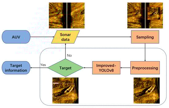 The rest of this study is organized as follows: in Section 2, we focus on the operational flow of underwater target detection based on AUV-carrying side-scan sonar and analyze specific improvement strategies for the model. Section 3 focuses on the general analysis of the dataset and training strategy, as well as the design of the experiments and discussion of the results. Section 4 provides the final conclusions and directions for future work.