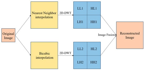 A wavelet transform is a localized transform method for image processing based on time, space, and frequency, which can decompose a signal or image into components of different frequencies and different times. This decomposition method is very useful for extracting local features of a signal or image. In image processing, the wavelet transform can decompose an image into multiple sub-images of different scales and orientations to extract the detailed information of the image. After the low-frequency and high-frequency parts are processed differently, they are then reconstructed to get richer detail information and achieve the purpose of image enhancement. The specific operation flow is shown in Figure 2.