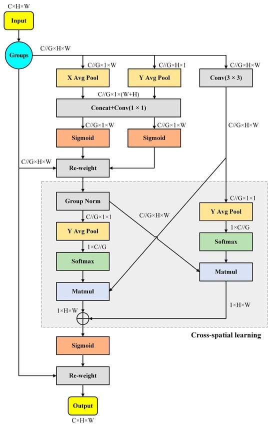 The attention mechanism has been widely used in computer vision, and its basic principle is to suppress useless feature information while reinforcing useful feature information to enable the model to focus more adaptively on important regions in the image. The traditional SE (squeeze-and-excitation) [] attention mechanism mainly focuses on constructing interdependencies between channels, with less consideration for spatial features. CBAM (convolutional block attention module) [] improves the model performance by effectively combining spatial attention and channel attention model performance, but it can only effectively capture local information and is difficult to establish long-distance channel dependencies.
