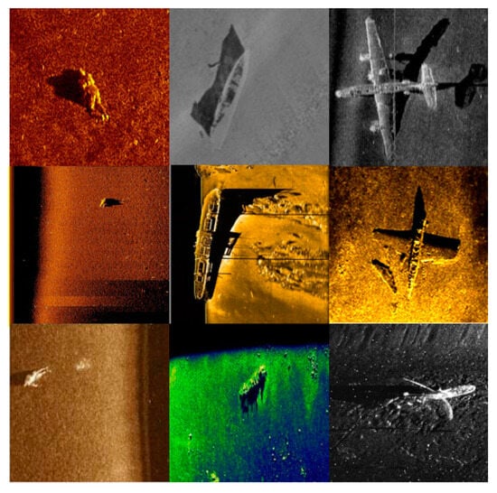 The dataset used for experiments in this paper mainly consists of side-scan sonar shipwreck images, airplane wreckage images, and human image data. The side-scan sonar dataset consists of three types of side-scan sonar images, totaling 1584 images, obtained by various hydrographic departments and domestic manufacturers using mainstream domestic and foreign side-scan sonar instruments and equipment such as Klein3000, EdgeTech4200, Yellowfin, and SS900 series, which are measured in the regions of the Yellow Bohai Sea, the East Sea, and the South China Sea in China, as well as collected on the network. Some samples are shown in Figure 8.