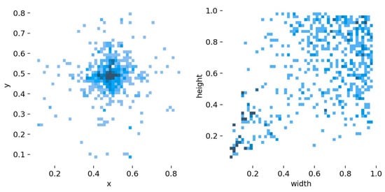 To better analyze the characteristics of the targets in the dataset, the distribution of the location of the targets in the picture as well as the aspect ratio of the targets, such as shipwrecks and airplanes, relative to the picture were counted, in which the depth of the color represents the number of targets, and the specific statistics are shown in Figure 9.
