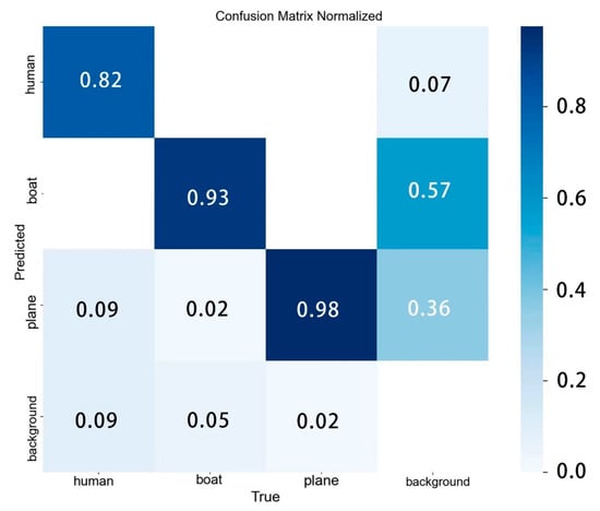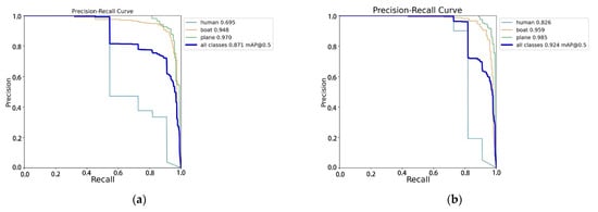 Figure 13 shows the prediction results. The location of the prediction box for target detection by the improved model is more accurately focused on the target itself, and the confidence scores are all improved to some extent, while we can notice that in the third set of images regarding the prediction of the airplane wreckage, the original model misjudges the undersea reef in the background as an airplane, whereas this problem does not occur in the improved model. The comparison clearly shows that the improved model achieves more accurate object localization and some degree of confidence score improvement.