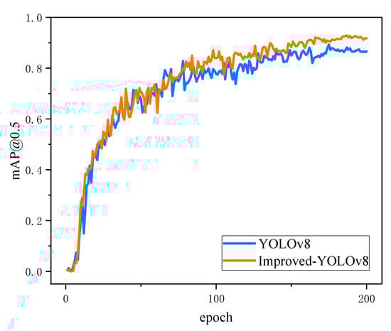 Figure 10 shows the confusion matrix for the improved model. The horizontal axis represents the true values, and the vertical axis represents the predicted values, and it can be seen that most of the predicted values correspond to the true values. Figure 11 shows a comparison of the mAP@0.5 curves of the improved model and the baseline model, and it can be seen that the improved curves are higher than the baseline model. Based on the data of these two figures, it is found that the improved model has better prediction performance.