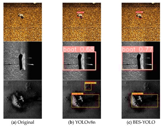 According to the data in Table 4, the Neck part of YOLOv8n is reconstructed using the Bifpn concept, and feature fusion is performed through Bifpn, which allows the information to be propagated bi-directionally between different resolution levels and better fuses multi-scale target information. The mAP@0.5 of the model is improved by 3.9%, and mAP@0.5:0.95 is improved by 0.9%. At the same time, the EMA module is added to the backbone of the baseline model to fuse contextual information at different scales, and effective channel descriptions are learned without channel dimensionality reduction during the convolution operation, enabling the model to produce better pixel-level attention to high-level feature maps, resulting in an increase of 3.5% in mAP@0.5 and 1.1% in mAP@0.5:0.95, respectively. Finally, we replace the loss function of the original baseline model with Shape-IoU to further improve the detection accuracy of the model, which is shown by the data to increase the mAP@0.5 by 2.7% and mAP@0.5:0.95 by 2.5%. Overall, the BES-YOLO model combines the Bifpn, the EMA attention mechanism, and the Shape-IoU loss function, which far exceeds the original YOLOv8 model in detection accuracy. On the same dataset, the BES-YOLO model achieves a 5.3% increase in mAP@0.5 and a 4.4% increase in mAP@0.5:0.95, indicating that the corrected model has significantly improved the detection accuracy of multi-scale targets. For a comparison of the accuracy between the original model and the improved model, please refer to Figure 11.
