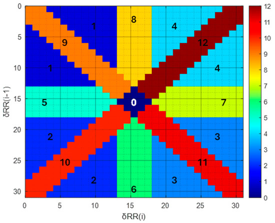The AF detection algorithm presented by Sarkar et al. [50] is based on the analysis of inter-beat interval (RR interval) time series via the Lorenz’s scatter plot. This plot is constructed from the time series of the differences in duration between successive couples of RR intervals. The difference in duration of a couple of RR intervals is defined as δRR(i) = RR(i) − RR(i − 1). The Lorenz’s scatter plot represents δRR(i) as the x-coordinate versus δRR(i − 1) as the y-coordinate. The scatter plot domain is limited to about −600 ms to +600 ms for both axes and it is quantized in 31 by 31 bins (see Figure 3). The algorithm proposed by Sarkar et al. [50] considers the RR intervals within an optimal time window of 2 min and calculates the occurrences of successive δRR in the scatter plot bins. Then, the occurrences are further evaluated based on 13 zones (or segments) of the scatter plot domain, which are numbered from 0 to 12 and colored with different hues in Figure 3. Region 0 is centered at the origin of the scatter plot and extends with a radius equal to 80 ms, which is related to the typical RR duration variability of Normal Sinus Rhythm (NSR).