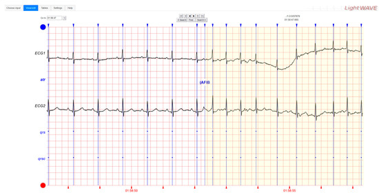 The performance of the developed system was evaluated by means of ECG signals containing episodes of atrial fibrillation accurately annotated by specialist cardiologists. The signals belonging to the publicly available “MIT-BIH Atrial fibrillation Database” [57] were considered. No other human subjects were involved in this study. The database contains ECG recordings of 23 patients with episodes of atrial fibrillation. The ECG signals were sampled at a rate of 250 samples per second with a 12-bit resolution across a voltage range of ±10 millivolts. The duration of each recording is approximately 10 h. For each recording, expert cardiologists recognized and annotated homogeneous ECG tracts corresponding to normal rhythms, episodes of atrial fibrillation, and other possible arrhythmias, marking exactly the start time and end time of each tract. This information constitutes the ground truth, i.e., the reference data, for the comparison tests performed. An example of ECG recordings is shown in Figure 4. Only the patient labelled 07859, exhibiting a particular type of atrial fibrillation with an unusual constancy of heart rhythm, was discarded. Therefore, the performance tests were carried out on 10-h ECG recordings of 22 AF patients.