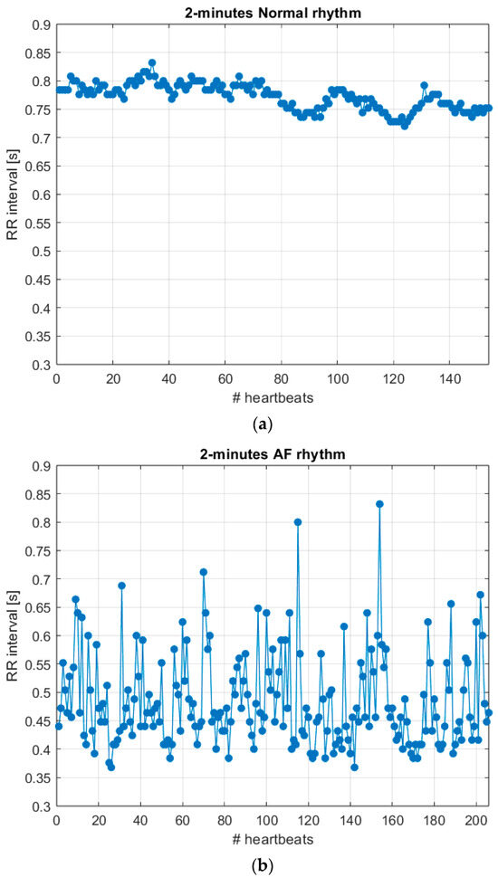 Examples of 2-min tachograms from patient 07879 in cases of (a) normal rhythm and (b) atrial fibrillation.