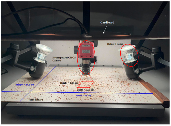 Illumination is provided by two 50 W halogen lamps positioned 28 cm above the board at an angle of approximately 45 degrees to the camera. Despite the spectral dataset provided by the sensor, each image’s coverage is inherently limited to a region size of 1.85 cm × 3.55 cm, representing only 0.26% of the entire board as depicted in Figure 2. A total of 2,228,224 pixels per region contribute to the detailed hyperspectral image capture process. To ensure accuracy and quality control in our analysis, a manual verification step is implemented. To address the limitations of the current setup and improve image acquisition, our goal is to enable broader region coverage and more efficient mite identification. Drawing inspiration from numerous studies utilizing a roller mechanism for scanning the entire board [23], we aim to incorporate a scanning approach into our methodology and capture panoramic images as a solution to cover the entire sample efficiently. Furthermore, building upon insights from a related study [24], we plan to enhance Varroa mite identification efficiency by incorporating an alternative light source, such as near-infrared (NIR) illumination. This strategic approach aims to further improve the automated counting process by better highlighting Varroa mites and continually refining our detection capabilities.