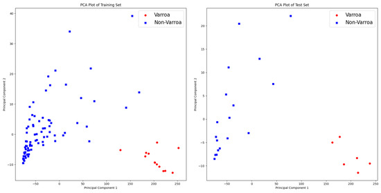 This representation is obtained after implementing a dual dataset split to accelerate the processing. We first extract 80% of the data for analysis and then partition it into training and testing sets, with 90% allocated for testing. In our analysis, we utilize 5 principal components, which collectively explain approximately 93.58% of the total variance in the dataset. PCA enables us to condense the original hyperspectral data, consisting of 25 channels, into a smaller set of components while retaining the most important information. In the Varroa shape analysis phase, segmented images are processed to extract essential features. Varroa shapes are labeled as Class 1, while shapes with different parameter values are labeled as Class 2, resulting in a total of 11 extracted features. For feature selection, we utilize the SelectFromModel method from the sklearn library. This method employs the Random Forest classifier, trained with 100 decision trees, to identify the most informative features based on their importance scores. Six features, including the Area, Perimeter, Radius, Convex-hull-area, Solidity, and Circularity, are selected to be the most valuable for characterizing Varroa shapes. Figure 7 illustrates the PCA visualization of the dataset used in the shape detection phase. The left subplot shows the distribution of instances in a 2D space obtained through a Principal Component Analysis (PCA) for the training set, while the right subplot illustrates the distribution for the test set. Instances belonging to the “Varroa” and “Non-Varroa” classes display distinct clusters, indicating the potential separability between the classes in the reduced space. However, it is important to note that this analysis is based on a small dataset.