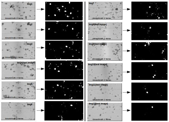 In Table 2, the reported results were obtained following a dual dataset split aimed at expediting the processing. Each image designated for segmentation underwent resizing from its original dimensions (1088, 2048) to updated ones (200, 400) using OpenCV’s resize function before being provided to the kNN classifier. This resizing process involved adjusting the dimensions while preserving the content through interpolation. Each channel of the original image underwent interpolation for downsampling. These measures were implemented to enhance the computational efficiency and reduce the processing time. In Figure 8, we present the segmentation outcomes of the 12 images. After generating the initial segmentation result from the classifier, the image underwent further enhancement using a bilateral filter. With a kernel size of 9 and spatial and color sigmas set to 75, the filter aimed to enhance the shape of the Varroa while preserving important details for the subsequent shape analysis. With a kernel size of 9 and a spatial and color sigma of 75, the filter effectively smoothed blobs in the image while retaining the structural integrity of the Varroa.