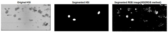 The visual comparisons of the segmentation results between the hyperspectral imaging (HSI) and RGB-like images are presented. The first image represents the original grayscale hyperspectral image, while the middle image illustrates the segmented hyperspectral image. The rightmost image displays the segmented image obtained from the RGB-like image. This comparison highlights the efficacy of utilizing fine-grained spectral composition in achieving well-defined Varroa shapes, contrasting with RGB-like channels that exhibit numerous misclassifications.