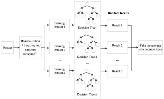 RF is an ensemble learning algorithm capable of generating numerous decision trees that serve as regression learners. The final prediction result of RF is derived from the mean value of all trees. The structure of RF is shown in Figure 1. Classification and regression tree (CART) is commonly employed as a decision tree for RF. Given a single output dataset , where , , and N is the number of samples, along with the decision tree algorithm and the number of base learners T, the steps for constructing a regression model using RF are as follows: