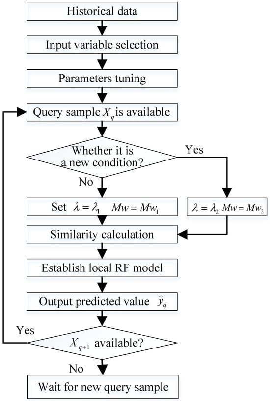 Although the above studies achieved enhanced results under certain scenarios, they hardly meet the need for timely updates in online applications [3,37]. To address this issue, Lv et al. [38] improved LSSVM and updated the model based on an incremental strategy. Li et al. [14] proposed a variable exponentially weighted MWPLS method, which can be adaptively updated by adjusting the window size. Lara F. A. [39] used the and Q statistics of principal component analysis (PCA) to determine whether a model needs to be recalibrated. Lv et al. [40] proposed an adaptive strategy by updating the operating dataset when the model’s performance deteriorates. The above methods have achieved good results in addressing specific problems. However, the model parameters are difficult to adjust. Consequently, they are difficult to directly apply to the real-time prediction of NOx concentration in thermal power plants. Recently, just-in-time learning (JITL) [41,42] has seen widespread adoption due to its intrinsic characteristics favoring online implementation. Instead of building a global model, JITL creates a local model based on the similarity between input and output samples in real time. By using the current measured input data, similar samples in the database are collected for modeling. Considering the advantages of JITL, an improved scheme based on JITL for online prediction of NOx emissions is proposed in this work. With the proposed strategy, a supervised similarity distance measurement method is defined to adaptively select important training samples from the original dataset. RF regression is adopted to establish a prediction model, and an active updating strategy is proposed to maintain the model online. Moreover, to establish a robust model, a variable selection method is proposed that enables the robust selection of important variables. The industrial application results show that the presented strategy can provide good prediction accuracy and is suitable for long-term industrial applications.