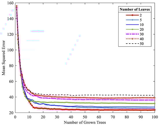 Two parameters should be adjusted when constructing a model using RF: the number of leaf nodes, i.e., , and the number of decision trees, i.e., . In this work, these parameters are adjusted based on the OOB error on the training set. The numbers of leaf nodes and decision trees that minimize the OOB error are regarded as the optimal parameters. As illustrated in Figure 4, when is 2, the corresponding curve is the lowest. After the number of decision trees is increased to more than 50, the of the OOB samples hardly decreases. Therefore, in this work, the values of and are set to 2 and 50, respectively.