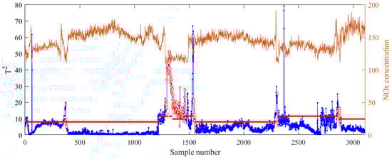 To improve adaptability to the multicondition process, MW-PCA was employed to determine whether the parameter needed to be updated. Experimentally, the window size was set to = 200 and monitored for 20 consecutive times. When the control limit was exceeded 15 times or more, an alarm signal was generated. This signal indicated that the process conditions had changed, and the parameter had to be updated. Figure 6 illustrates the monitoring results of MWPCA on the test set (the thick red line represents the control limit for each window, the blue line represents the calculated and the red circle represents the update time of the model).