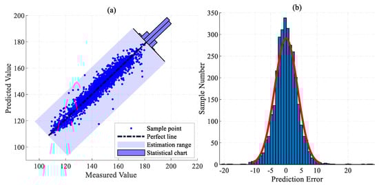 Scatter plot and error distribution diagram of the proposed model. (a) The scatter plot of actual measured and predicted values. (b) The distribution map of prediction error.