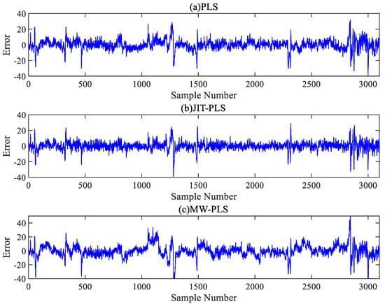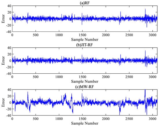Figure 9 and Figure 10 show the error distributions of the six comparative algorithms on the test set, illustrating that the RF model exhibited more stable prediction performance compared to the PLS model, with the JIT-RF model demonstrating the highest prediction accuracy. The incorporation of the JITL strategy into both the PLS and RF models resulted in a significant reduction in prediction errors. The range of error fluctuation also significantly improved, indicating the effectiveness of the JITL strategy. Conversely, the inclusion of the MW strategy led to a notable increase in prediction errors and the fluctuation range of errors. Thus, the addition of the MW strategy results in decreased accuracy due to the loss of input information and increased instability in prediction.