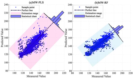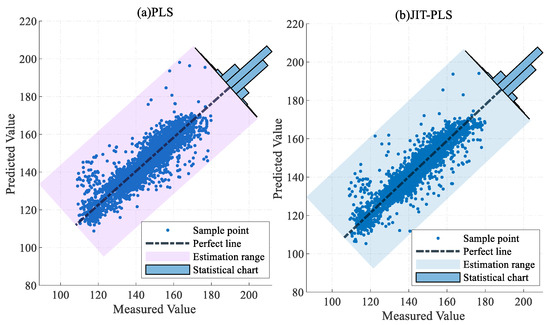 Figure 11, Figure 12 and Figure 13 present the error statistics and scatter plots. In Figure 12b, the NOx concentration predicted by the JIT-RF model and the actual measured values approximately follow the diagonal line. In contrast, Figure 13a demonstrates that the sample points predicted by the MW-PLS model deviate significantly from the perfect line. MW-PLS exhibited the worst and most unstable predictive performance, whereas the JIT-RF model had better predictive accuracy than the other models. After the addition of the MW strategy, the predictive performance of the MW-PLS and MW-RF models decreased (Figure 13), possibly due to the incomplete information in the training set caused by the MW strategy. After the JITL strategy was incorporated into the PLS and RF models, the sample points became closer to the perfect line (Figure 11b and Figure 12b), indicating that the prediction performance of the model improved and demonstrating the advantages of the JITL strategy.