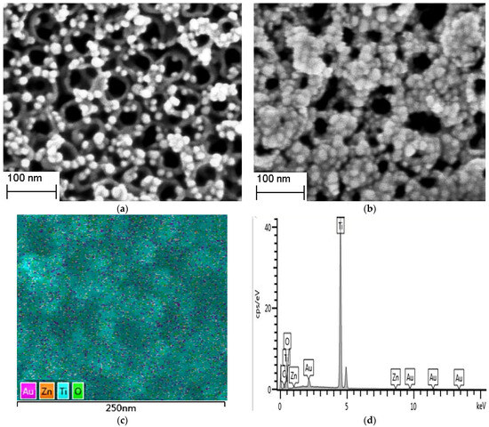 To observe the morphology and size of the prepared composite structures, SEM images of TiO2NTs/AuNPs and TiO2NTs/AuNPs@ZIF−8 are shown in Figure 1a,b, respectively. In Figure 1a, it is evident that the dispersed nanoparticles are uniformly distributed on the upper surface and inner walls of the regularly aligned nanotubes. By employing particle size distribution software, the nanotube diameters and the diameters of the gold nanoparticles on the surface were measured, revealing an average nanotube diameter of 50 nm and an average gold nanoparticle size of 15 nm. Upon coating with the ZIF−8 shell, the nanoparticles in Figure 1b exhibit bright cores surrounded by lighter-colored shells. Applying the particle size distribution analysis software, the particle sizes of each nanoparticle with the shell were statistically analyzed, and the average value was calculated. By subtracting the average particle size of the gold core from this average value and dividing the difference by 2, the average ZIF−8 shell thickness was determined to be 6 nm. To validate the element distribution of the composite structure, an EDS analysis was performed on the TiO2NTs/AuNPs@ZIF−8 nanocomposite, as shown in Figure 1c. The image demonstrates a uniform distribution of elements including Zn, Au, Ti, C, and O across the composite surface. Furthermore, the EDS spectrum in Figure 1d provides a clear overview of the composition and corresponding content of these elements in the nanocomposite, confirming the successful encapsulation of ZIF−8 on the TiO2NTs/Au surface. In summary, the obtained composite structure comprises TiO2NTs/AuNPs@ZIF−8.
