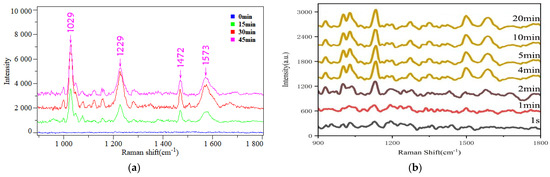 (a) The SERS spectra of 1 ppm gaseous acetophenone adsorbed on the surface of TiO2NTs/AuNPs@ZIF−8 nanocomposites with different ZIF−8 shell thicknesses for 30 min; (b) SERS spectra of 1 ppb gaseous acetophenone adsorbed on TiO2NTs/AuNPs@ZIF−8 nanocomposites with ZIF−8 shell thickness of 6 nm for different times.