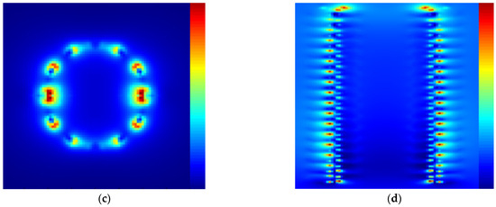 Sensitivity, reproducibility, selectivity, and reusability serve as fundamental parameters for evaluating the performance of nanocomposites as SERS substrates for gaseous VOCs. To further observe the relationship between the Raman signal intensity of acetophenone and its concentration, different concentrations of acetophenone were used as test samples, and TiO2NTs/AuNPs@ZIF−8 (with ZIF−8 shell thickness of 6 nm) was employed as the SERS sensor. Under identical conditions, SERS testing was conducted, and the results are shown in Figure 4a. It could be found that the prepared TiO2NTs/AuNPs@ZIF−8 have a significant enhancement effect on the Raman signal of acetophenone. All samples displayed distinct Raman peaks characteristic of acetophenone, exhibiting identical peak positions. Notably, the Raman signal intensity was observed to decrease with decreasing acetophenone concentration, indicating a strong linear correlation (R2 = 0.9709, using the 1573 cm−1 Raman peak as the reference). When the concentration is reduced to 10−11 M, a weak Raman peak of acetophenone can be observed, but when it is further diluted to 10−12 M, almost no Raman peak of acetophenone can be observed. Therefore, it is concluded that the TiO2NTs/AuNPs@ZIF−8 have a detection limit of gaseous acetophenone as low as 10−11 M. This detection limit is lower than the content of acetophenone in the exhaled breath of breast cancer patients, indicating that the prepared nanocomposites can be used for direct detection of acetophenone in the exhaled breath. Based on the SERS enhancement mechanism, the SERS enhancement effect of this SERS nanocomposite originates from electromagnetic enhancement and chemical enhancement, with electromagnetic enhancement playing a dominant role. In order to explore the SERS electromagnetic enhancement mechanism of the as-prepared SERS nanocomposites, finite-different time-domain (FDTD) was used to analyze the electromagnetic field enhancement. The boundary condition was set as the perfectly matched layer. The incident light was set as a plane wave with a 532 nm wavelength, with propagation in the x-direction and polarization in the z-direction. The spatial parameters were set as follows: the time step was 0.0006 fs; the mesh size was 1 nm; the background index was 1.0 (air). Figure 4c,d shows the great enhancement of the electromagnetic field between two Au NPs on the surface of TiO2NTs, which is called the “hot spot”. Due to the dense and uniform distribution of Au NPs on the surface of TiO2NTs, a large number of “hot spots” are formed in the three dimensional space, thus improving the sensitivity of the substrate.