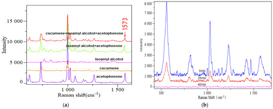 To further evaluate the detection selectivity of gaseous VOCs on the surface of the SERS nanocomposites, this article used the nanocomposites prepared under the same conditions as the enhancement substrate. Three commonly exhaled VOCs and their mixtures were used as test samples separately. Under the same adsorption and testing conditions, the measured SERS spectra are shown in Figure 5a. It could be observed that they all exhibited corresponding Raman peaks. Among them, Raman peaks appeared at 1573 cm−1 in the SERS spectra of acetophenone, the mixture of acetophenone and isoamyl alcohol, and the mixture of all three VOCs, but this peak did not appear in the SERS spectra of the other two VOCs alone. This indicates that the Raman peak at 1573 cm−1 can be used as a characteristic peak for acetophenone, and the substrate prepared in this study has a certain selectivity for the detection of acetophenone in VOC mixed gases containing acetophenone.