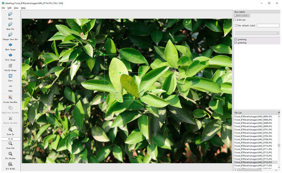 The training of the citrus Huanglongbing image dataset is inseparable from the position data and category data of the Huanglongbing leaves in the image, which requires the annotation of the citrus Huanglongbing image. LabelImg 1.8.6 (as shown in Figure 1) software was used to label the leaves with Huanglongbing disease in the image one by one. The minimum external rectangular box was selected for labeling, and the .txt format file that can be recognized by the YOLO model was selected. The file includes the name of the corresponding image, the number of labels in the image, the index of the label category, the x and y coordinates of the center point of the rectangular box corresponding to the label, and the correspond to the values of w and h.