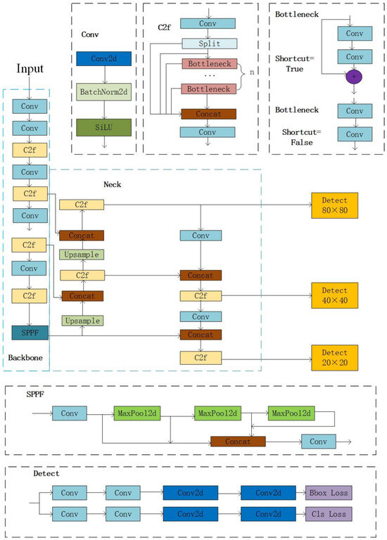 As a typical model of one-stage object detection, YOLO is widely used in real-time detection for its faster running speed. The YOLOv8 network is divided into YOLOv8n, YOLOv8s, YOLOv8m, YOLOv8l, and YOLOv8x according to the model depth multiple and layer channel multiple to meet the needs of different scenarios. YOLOv8 can be divided into four parts: input, backbone, neck, and head, and its structure is shown in Figure 2. The input is responsible for scaling the input image to the size required for training, including data enhancement operations such as scaling, changing image tone, and mosaic data enhancement. The backbone network is utilized to extract target features, which are composed of the convolution module Conv, C2f structure with richer gradient information, and the SPPF module used in YOLOv5. The neck is employed to enhance the fusion of features of different dimensions. Its structure is modeled after the feature pyramid networks (FPN) and path aggregation feature pyramid networks (PAFPN) architecture [35], with the exception of omitting the convolution operation in the up-sampling stage of YOLOv5. The head part is adopted to calculate the enhanced features and finally obtains the confidence and position of different objects.