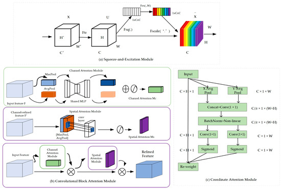 Attention mechanism is a key concept widely used in the field of deep learning, which is used to simulate the degree of attention to regions of interest in human visual and perceptual systems. At present, the attention mechanism methods are mostly based on the integration of channel or spatial information in different dimensions. Its essential role is to enhance the extraction of key features, so it is widely used in deep-learning neural networks to improve model accuracy. As a representative of channel attention, Squeeze-and-Excitation (SE, Figure 3a) networks employ an autonomous learning approach to capture the significance of each channel in the feature map. Subsequently, this significance is utilized to assign a weight to each channel, enabling the neural network to prioritize attention on the channels that are most beneficial for the current task. However, the SE attention mechanism only focuses on inter-channel information and ignores the importance of location in the coding process. The Convolutional Block Attention Module (CBAM, Figure 3b) is used to realize a sequential attention structure from channel to space, utilizing both the channel and spatial domains. It attends to the image in terms of both channels and space, thus enhancing the network’s feature representation ability. For CBAM, convolution is used to calculate spatial attention to establish spatial location information, but such convolution calculations can only be used to capture local relationships and cannot capture long-distance dependencies. Coordinate attention [36] (CA, Figure 3c) is generated through coordinate information embedding and coordinate attention. It not only enables CA to capture long-range dependencies within channels but also helps retain precise location information, allowing the network to localize targets more accurately. However, the importance of interactions is often ignored between spatial positions. The Efficient Multi-Scale Attention Module with cross-spatial learning (EMA) [37] further extends the CA attention mechanism by incorporating cross-spatial learning, which compensates for the shortcomings of the CA attention mechanism. The EMA mechanism is designed with versatility in mind, allowing it to be easily integrated into various existing neural network architectures, thereby enhancing the performance and efficiency of the models and making it applicable to a wide range of computer vision tasks.