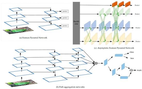 In the field of computer vision, identifying objects of different sizes is a basic challenge. The feature pyramid above the image pyramid is the cornerstone of the standard solution [38]. Feature pyramid network (FPN, Figure 4a) fuses low-resolution, semantically strong features with high-resolution, semantically weak features through top-down paths and horizontal connections. This forms a feature pyramid that is semantically rich at all levels and can be constructed rapidly from a single input image scale. However, FPN directly fusing high-level features with low-level features can diminish the multi-scale representation capability. Path aggregation feature pyramid network (PAFPN, Figure 4b) enhances the connections and path aggregation of FPN by adding a bottom-up path, thus providing a more powerful multi-scale feature representation. However, the high-level or low-level features of PAFPN may be lost or degraded during propagation. Fortunately, the asymptotic feature pyramid network (AFPN, Figure 4c) is first used to fuse the low-level features from the backbone network and then gradually integrates the high-level features into the fusion process, which can avoid the large semantic gap between non-adjacent levels and retain useful information in the propagation process. Adaptive spatial feature fusion [39] (ASFF) plays a crucial role during the feature fusion process of AFPN. It avoids the contradictory information from non-adjacent hierarchical features by learning the relationship among different features.
