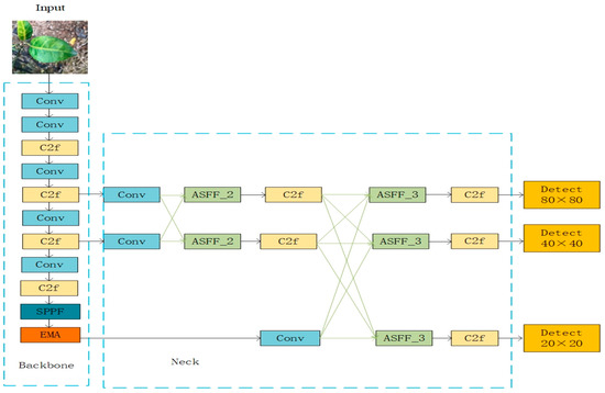 YOLO-EAF structure, the backbone and neck are circled by blue dashed frames. The Light blue represents Conv, light yellow represents C2f, dark blue represents SPPF, orange part is the EMA module, the light green part is the ASFF module, and light orange represents Detect.