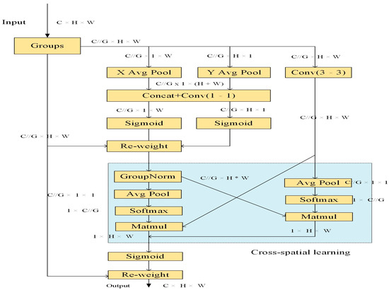 It can be seen from Figure 6 that EMA mainly has three stages. The first is the feature grouping stage, for any given input features . EMA is utilized to divide X into G sub-features along the cross-channel dimension in order to learn distinct semantics, and the overall grouping is represented by Formula (1).