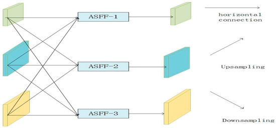 In Figure 7, the ASFF module integrates three levels of features. represents the feature vector from the l layer to the n layer at the position , and the obtained feature vector is denoted as . The weighted feature fusion formula of ASFF is: