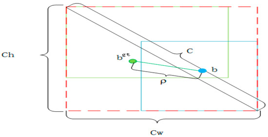 Among them, IOU is the intersection and union ratio of the prediction box and the real box. represents the Euclidean distance between the two center points. and represent the center points of the prediction box and the real box, respectively, c represents the diagonal distance of the minimum closure area that can contain both the prediction box and the real box, is suitable for the parameter to weigh, is a parameter used to measure the consistency of the aspect ratio, and its structure is shown as Figure 8. However, CIOU reflects the difference in aspect ratio through , rather than the true difference in confidence, so it sometimes hinders the optimization of similarity.