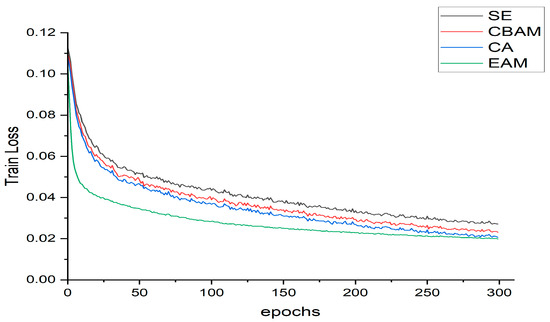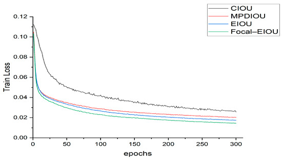 The data show that when Focal–EIOU is used as the loss function, the overall accuracy of the model is 5.1, 4.2, and 0.2 percentage points higher than that of using CIOU, MPDIOU [42], and EIOU, respectively. The mAP(0.5) has also increased by 0.7, 0.5, and 0.2 percentage points, respectively, and the -score has increased by 0.96, 0.66, and 1.54 percentage points, respectively. However, the number of model parameters (params) and computational complexity (GFLOPs) remain unchanged. In addition, Figure 10 depicts the loss curves of the four loss functions during model training. By observing these curves, we found that whether it is CIoU, MPDIOU, EIOU, or Focal–EIOU, they can all quickly reduce model loss and stably maintain it at a low level. However, Focal–EIOU’s loss decreases faster and has a smaller convergence loss. Overall, the comprehensive performance of using Focal–EIOU as the loss function is relatively obvious, and the detection accuracy is the highest.