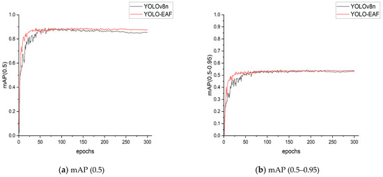 Figure 11 shows the comparison curves of mAP (0.5) and mAP (0.5–0.95) on the training set and validation set of YOLOv8n and YOLO-EAF models. It can be seen from the figure that after improvement, the average precision oscillation of the model is weakened and tends to be stable quickly, and the average precision curve of YOLO-EAF is better than that of YOLOv8n.