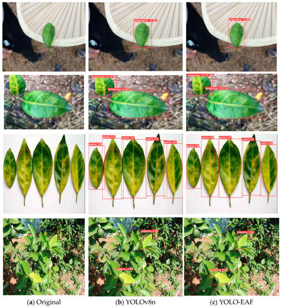 From Table 3, it can be seen that after adding the EMA attention module to the backbone, the mAP (0.5) of the detection model increased by 1 percentage point, indicating that after adding the EMA module, the ability to extract effective features of citrus Huanglongbing was enhanced. After introducing the ASFF feature fusion module in the neck part, mAP (0.5) is increased by 1.9 percentage points, which proves that ASFF can fuse the original multi-scale features extracted by more backbone networks and make the feature fusion more reasonable. After changing the CIOU loss function of YOLOv8n to Focal–EIOU, mAP (0.5) increased by 0.7 percentage points, indicating that replacing Focal–EIOU can be utilized to solve the conflict between the classification problem and the regression task of citrus Huanglongbing feature, which not only accelerates the convergence speed of the model but also improves the detection accuracy of the model. In general, the YOLO-EAF model proposed in this paper has an accuracy rate of 82.7%, which is 8.4 percentage points higher than the original YOLOv8n model. Although the recall rate decreased by 1.2 points, the mAP (0.5) increased by 3.3 percentage points. The above data show that compared with YOLOv8n, YOLO-EAF has stronger feature extraction and multi-scale feature fusion capabilities and has better performance in the detection of citrus Huanglongbing.