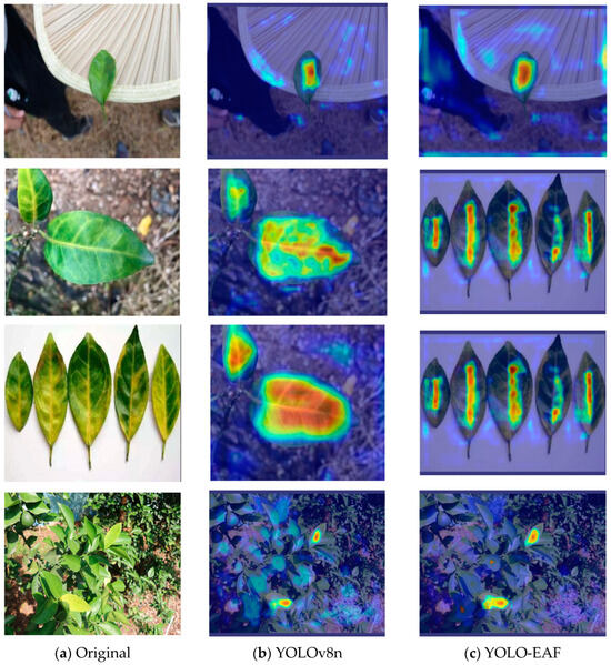 The visualized heat map can visually display the areas on the image that the model considers to contribute greatly to the object detection task, which can be used to explain the results of the model prediction. In this paper, Grad-CAM [43] was used to generate the object detection heat map. Grad-CAM is a gradient-based neural network visualization tool. We used the gradient information of the last convolutional layer to calculate the weight of each channel and map the weighted feature map to the original image in the form of a heat map. The detection heat map results of some citrus Huanglongbing images are shown in Figure 13. It can be seen from the thermal region shown in the figure that the deeper the red, the greater the weighted feature weight. Also, it can be seen that the thermal value of YOLO-EAF is higher than that of the YOLOv8n model, and the improved model pays more attention to the target area.