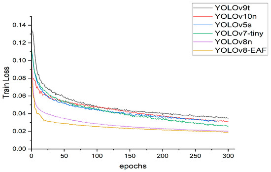 During network training, compare the downward trend of the loss function in the YOLO series in the experiment. Compared with other YOLO models, YOLO-EAF’s loss drops faster.