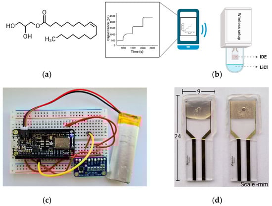 (a) Chemical structure of monoolein. (b) Schematic illustration showing wireless Adafruit nRF52832 BLE setup for continuous capacitance measurements, where change of capacitance resulting from different molal concentrations of LiCl was continually measured (created with BioRender.com). (c) Photograph of the wireless Adafruit nRF52832 microcontroller coupled with ADS 1115 digital-to-analog converter. (d) Photographs of laminated IDE dry (right) and covered with MO droplets (left).