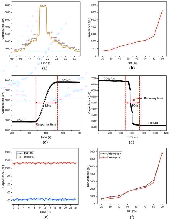 Initial capacitance measurements with MO-coated IDEs were carried out at room temperature (RT), as illustrated in Figure 4a. The IDEs were initially exposed to selective RH values, with baseline capacitance measurements conducted in a nitrogen chamber before the IDEs were subjected to increasing RH levels. There was a slight increase in capacitance at 15% RH, followed by progressively larger increases up to the 80% RH range. As the RH values subsequently decreased, the C values also diminished, returning to levels comparable to those observed during the initial rise in RH. The results of these measurements, conducted in triplicate at room temperature with three different MO-coated IDEs, are depicted in Figure 4a, showing consistent repeatability and stability of the sensor response under varying humidity conditions.