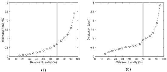 (a) Water sorption isotherm and (b) dissipation data as a function of RH of MO. Data obtained with QCM-D measurements on an MO film with approximately 100 nm thickness. Data in (a) are based on the Sauerbrey equation with overtone 1. Dissipation data are shown for overtone 11. The grey shaded area marks the transition from a solid lamellar phase into a liquid crystalline lamellar phase [].