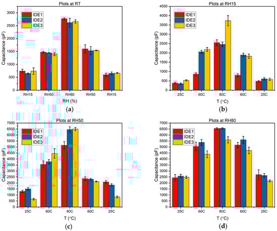 This decrease is likely due to a temperature-induced phase transition in the MO film on the IDEs. For the RH 80% scenario with temperature-varying capacitance measurement (Figure 4d), an increase in capacitance was observed up to 80 °C. However, a decreasing trend was noted when the temperature values were subsequently reduced. This pattern demonstrates the reversibility of the sensor platform, indicating its potential for reliable and repeated use in varying environmental conditions. This reversibility is a crucial attribute for sensors operating under diverse temperature and humidity conditions, enhancing their utility across different applications.