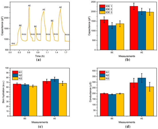 The changes in capacitance depicted in Figure 5c can indeed be attributed to variations in SH. When the sensor comes into direct contact with the skin, it alters ε of the MO layer, leading to an increase in capacitance. This behavior is clearly illustrated in Figure 5c, where the capacitance peaks at a value similar to the initial measurement when the sensor is in contact with the skin. This demonstrates the reversibility of the MO-coated sensor’s response, as the capacitance increases upon skin contact and then decreases to a level comparable to that observed before the measurement at 30% relative humidity (RH), as monitored by the hygrometer. Figure 5d displays measurements performed in triplicate with three different MO-coated IDEs. Each set shows the average of three measurements taken with each IDE, labeled as IDE 1, 2, and 3. This setup is designed to illustrate the variability between measurements, highlighting the repeatability and reliability of the sensor across multiple tests and conditions. Such detailed analysis helps underscore the sensor’s consistent performance and its potential utility in various practical applications where monitoring SH is critical.