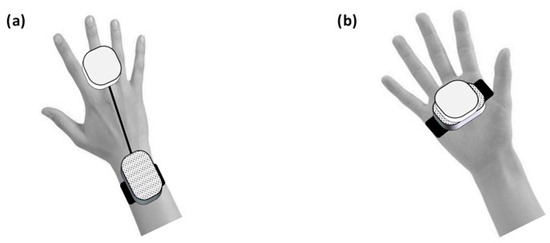 The tags (5.4 × 8.5 × 0.1 cm; NCF MIFARE RFID, 1 K 13.56 MHz) were fixed on the single shelves of the cupboard and cabinet and the single drawers of the drawer unit. Specifically, each shelf and each drawer was fitted with a series of four or five tags, one next to the other (see Figure 1 for an illustration). The tags of each series had the same code number, which was recognizable by the tag reader. The tag reader consisted of two watch-like sections (of 6.5 × 4 × 1.5 cm and 4.5 × 4.5 × 0.9 cm). During the intervention phase of the study, one section was strapped on the participant’s wrist and the other on the back of the participant’s fingers (see Figure 2a). The section on the wrist included an electronic circuit, which was designed to send Bluetooth signals to the smartphone. The other section included an NFC module designed to recognize the identification code of the tag series. During the final (system wearing) test, the two sections were glued together and fixed to an elastic band so that the participants could put the system on and off independently (see Figure 2b).