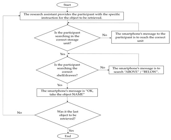 By searching with the hand on the shelves of the cupboard and cabinet or by introducing the hand to the drawers of the drawer unit, the participants’ tag reader (in particular the section with the NFC module) came close to one or more tags of the series available there. The tag reader recognized the tags’ code and sent a signal to the smartphone. The smartphone, which was programmed via the MacroDroid, delivered one of three possible messages. If the participants were searching in the wrong storage unit (this was known to the system because the tag reader had detected tag codes not belonging to the intended unit), the smartphone’s message to the participants was to reach the correct unit. If the participants were in the correct unit but were searching in a wrong shelf or wrong drawer (this was known to the system because the tag reader had detected the tag code of an object type located in that unit, but in a higher or lower shelf/drawer), the smartphone’s message was search “ABOVE” or search “BELOW”. If the participants were in the correct unit and were searching in the correct shelf or drawer (this was known to the system because the tag reader had detected the tag code of the object to be retrieved), the smartphone’s message was “OK, take the object NAME”. Figure 3 illustrates how the technological system worked within a session.