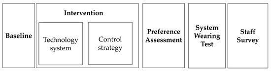 The study started with a baseline phase that included different numbers of sessions for the three participants, as in a multiple baseline design across individuals [32]. The baseline phase was followed by an intervention phase in which sessions with the technology system and sessions with the control strategy were regularly alternated for each participant according to an alternating treatments design [32]. This within-subjects design was chosen because it allowed us to compare the effects of the two intervention conditions (i.e., in terms of number of objects retrieved correctly per session and time required for retrieving them) for each participant individually. In addition to this evaluation, the study also included (a) a preference assessment (i.e., the participants were asked to choose whether they wanted to use the system or the control strategy before the start of the sessions), (b) a system-wearing test (i.e., a test to determine whether the participants could independently put on and off the system with its two sections glued together; see Figure 2b), and (c) a staff survey in which staff personnel were asked to rate the technological system. Figure 4 shows the sequence of the study phases.