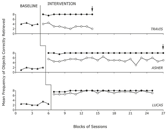 Figure 5 summarizes the participants’ performance during the baseline and the intervention. The black triangles indicate the participants’ mean frequency of objects correctly retrieved per session over blocks of baseline sessions. Black and empty circles indicate the participants’ mean frequency of objects correctly retrieved per session over blocks of intervention sessions with the technological system and with the control strategy, respectively. The blocks included two sessions (three sessions if an arrow is present).