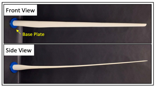The blade was 3D printed using the fused filament fabrication (FFF) method. This method allowed for convenient and repeatable fabrication and testing. FFF thermoplastic parts are also easily repairable so that one blade can be repaired and reused many times during experimental testing. The blade was fabricated with a Raise3D Pro2 printer [56] and Raise3D Premium PLA filament [57] (Raise3D, Lake Forest, CA, USA). It was printed in the longitudinal direction to best simulate uniaxial glass fibre. A 0.1 mm layer height and 100% infill were used to best represent the solid material used in the numerical model. The fully fabricated blade assembly is shown in Figure 4.