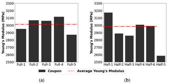 Young’s moduli of (a) uniform full-size 3D printed coupons and (b) half-sized coupons glued together.